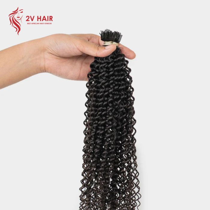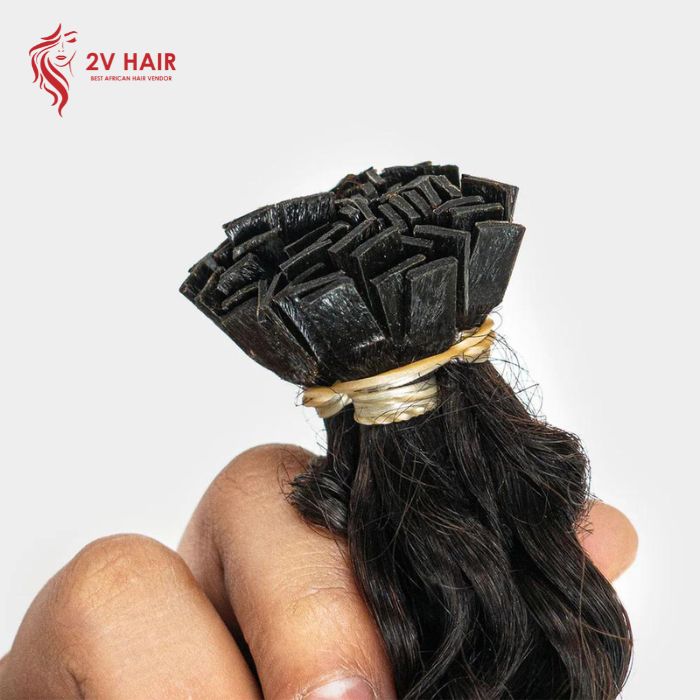 Curly Flat Tip extensions from 2V Hair are crafted from high-quality human hair. This ensures a lifelike appearance and the ability to withstand styling treatments.